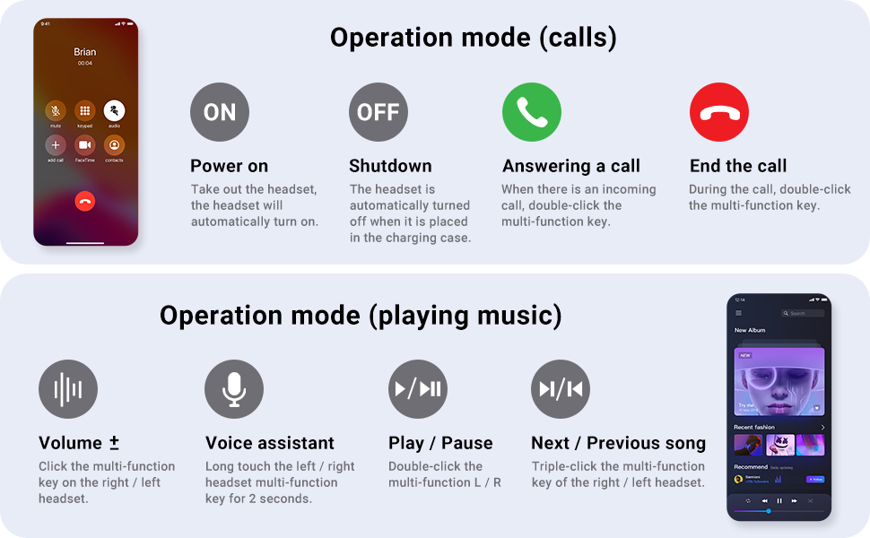 Bluetooth headphones with touch control sensors allows you to conveniently power on/off, play/pause, answer/hang up, adjust volume.